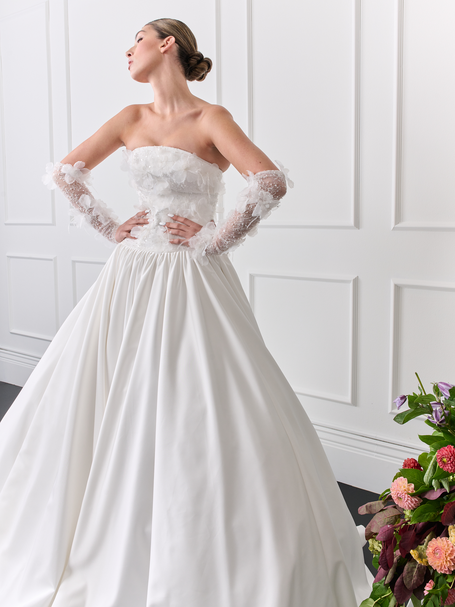 Presented at Canoe Studios, 601 W 26th St, New York, NY, the collection features 30 couture gowns that explore the beauty of art, translated to the bridal market through rich textiles, sculptural silhouettes, and romantic detailing. Each piece is handmade with the designer’s hallmark craftsmanship, blending architectural tailoring, delicate laces, luminous silk mikado, silk duchesse satin and a variety of sophisticated materials from all around the world.